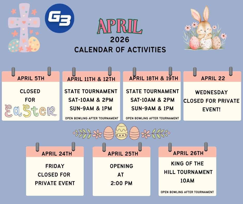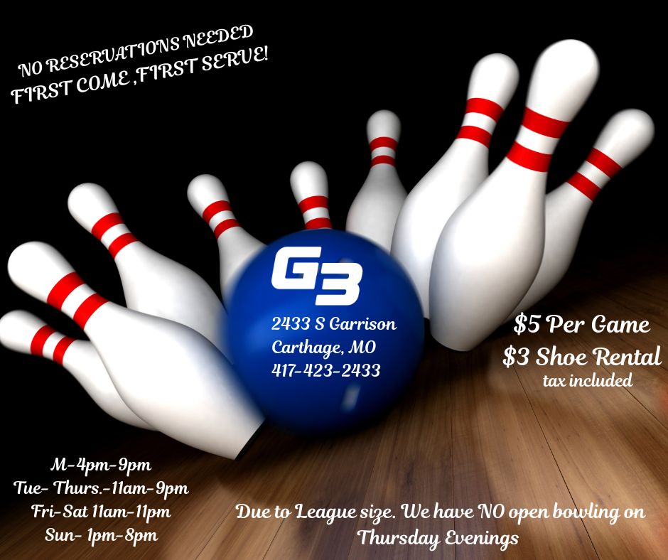 Please follow our Facebook page @g3carthage for up to date openings and cancellations
